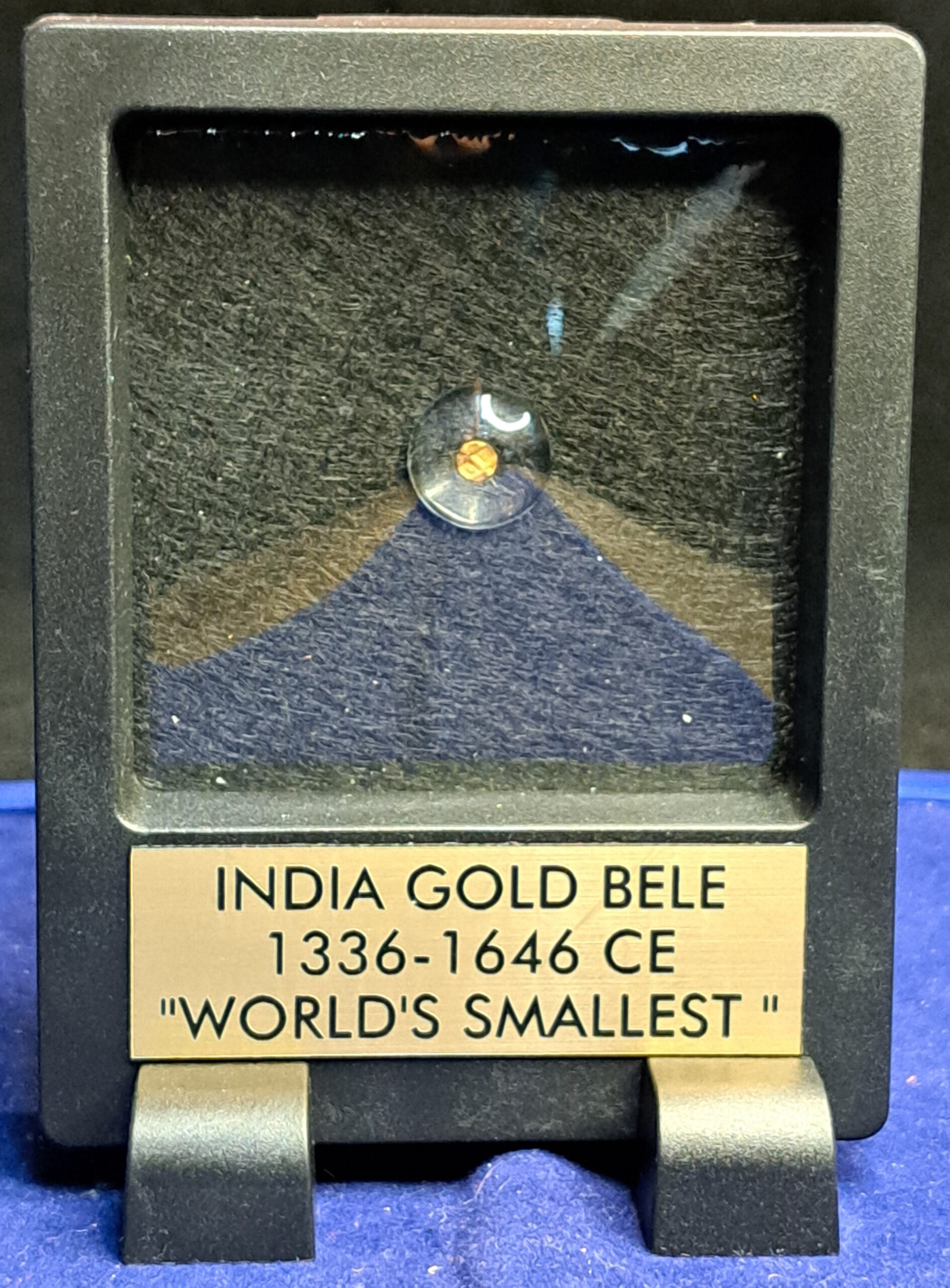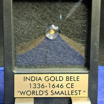 The India Bele gold coin is billed as the world’s smallest gold coin at only 4mm wide. On the obverse is a sacred image, while on the reverse, is the royal legend. We magnified both sides so that you can see the intricate designs.
